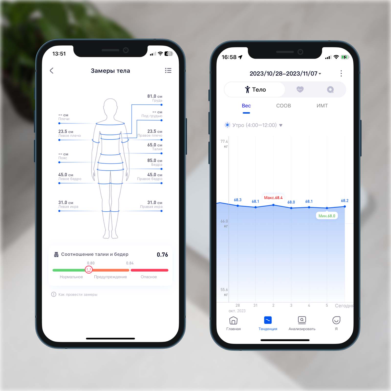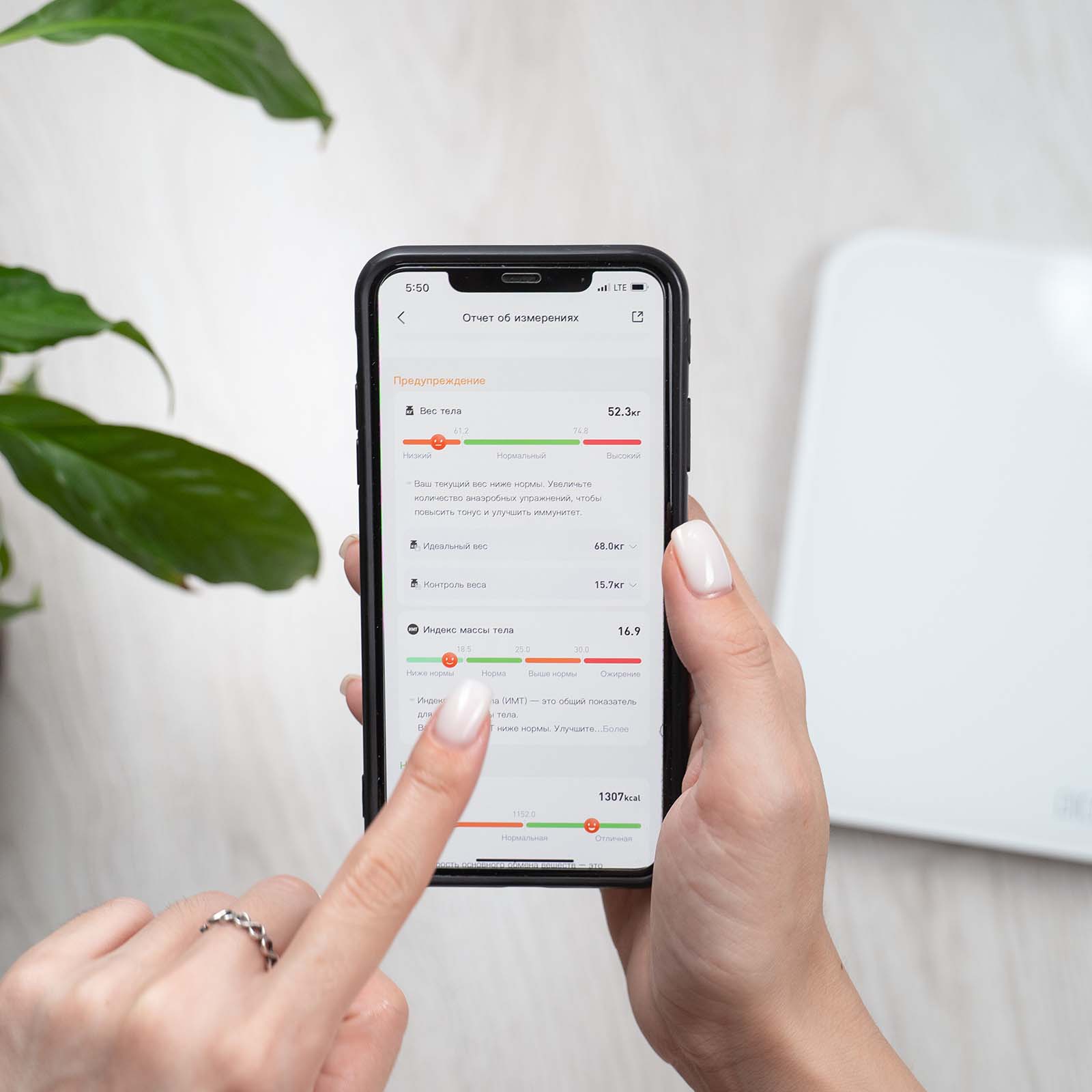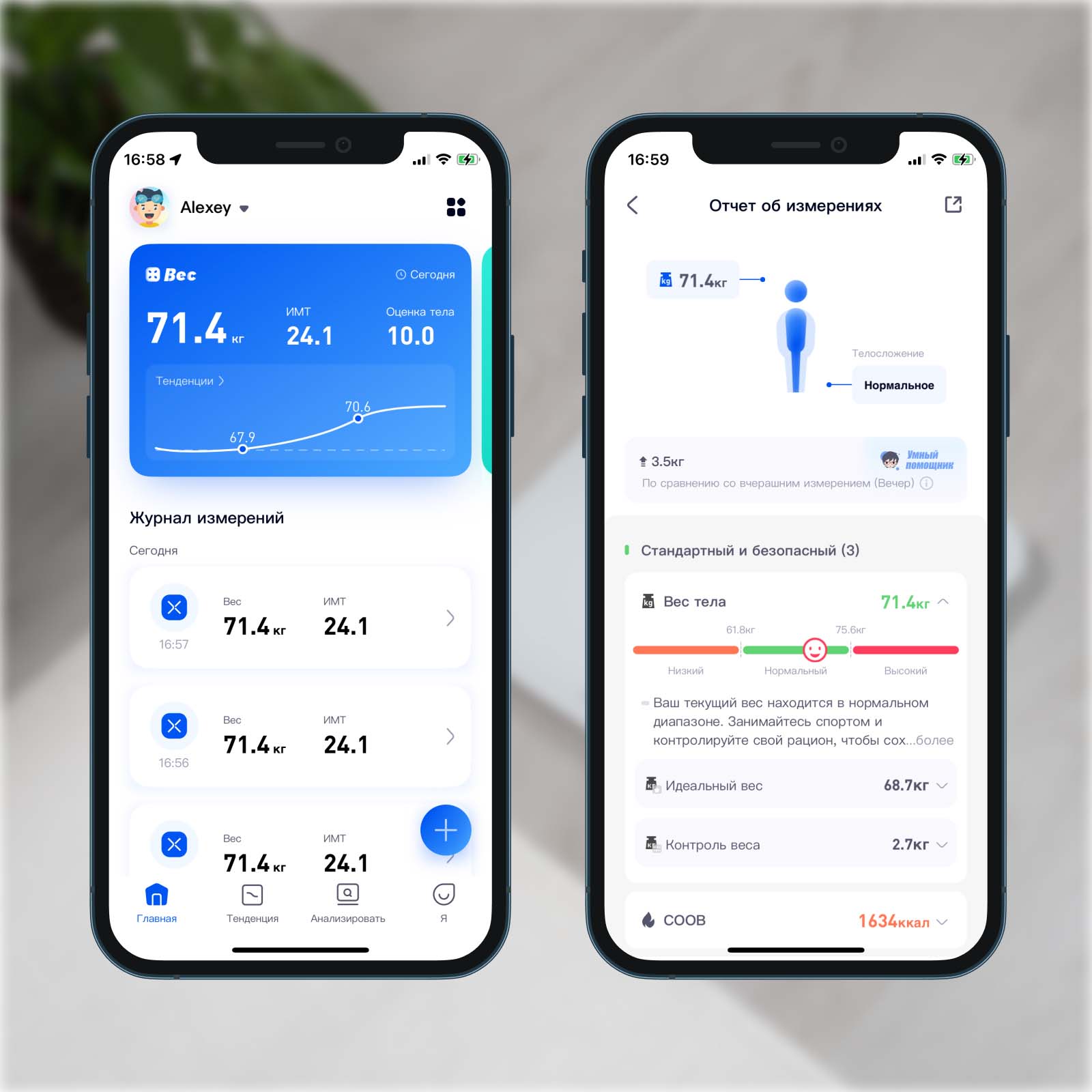 За изменениями веса, индекса массы тела, скорости базового обмена веществ и общей оценкой можно следить в журнале или на удобном графике прямо на главной странице приложения. Оно доступно для iOS и Android. Данные от весов синхронизируются с Apple Health и Google Fit.