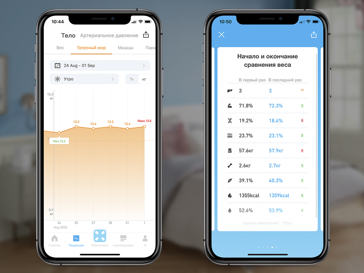 Наглядные диаграммы. Следите за изменениями с помощью графиков с гибкой настройкой — по весу, телесному жиру и мышечной массе. При отображении жира и мышц можно переключаться между процентами и килограммами и задавать временной интервал и даже время суток.