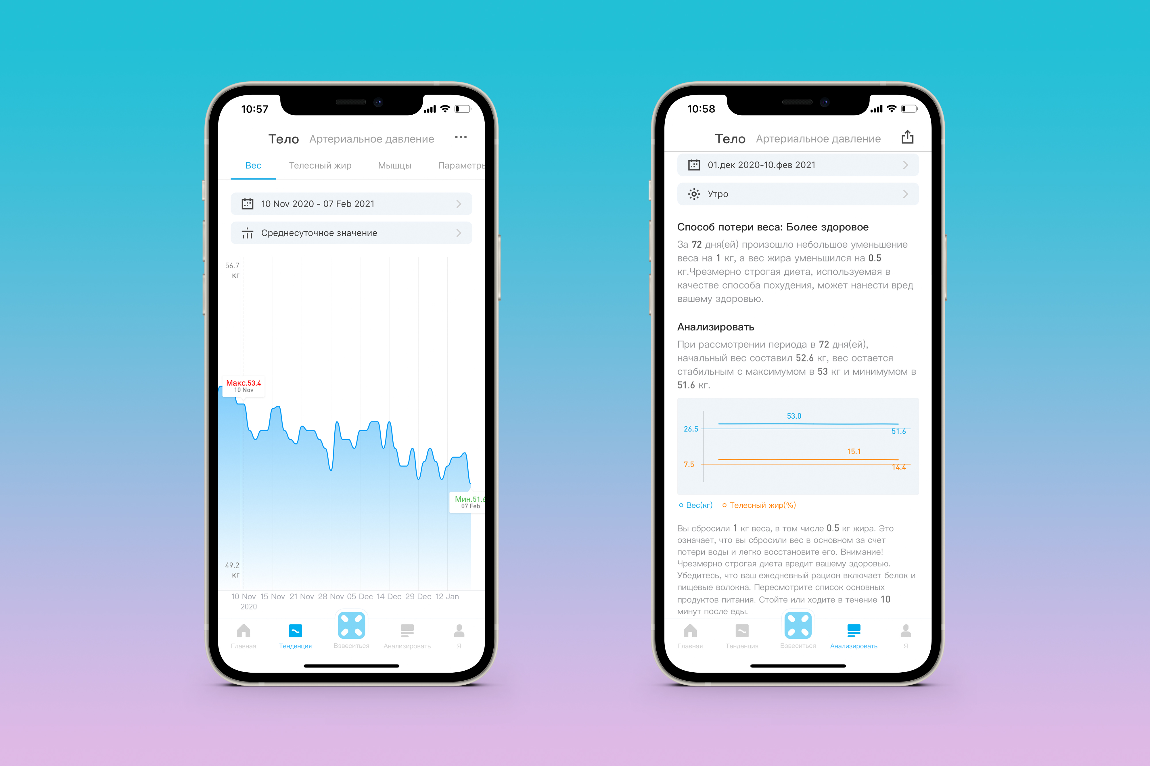 Наглядные диаграммы. Следите за изменениями с помощью графиков с гибкой настройкой — по весу, телесному жиру и мышечной массе. При отображении жира и мышц можно переключаться между процентами и килограммами и задавать временной интервал и даже время суток.