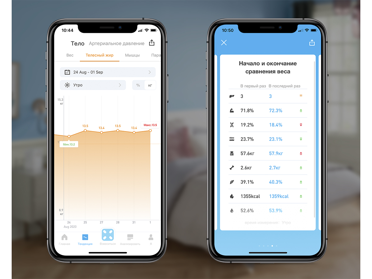 Наглядные диаграммы. Следите за изменениями с помощью графиков с гибкой настройкой — по весу тела, телесному жиру и мышечной массе. При отображении жира и мышц можно переключаться между процентами и килограммами и задавать временной интервал и даже время суток.