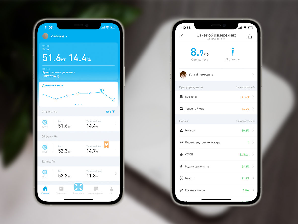 Баланс тела. Это не просто метрика, а специальный режим измерения качества работы вестибулярного аппарата. С его помощью можно оценить чувство равновесия. Важно понимать, что чувство равновесия можно и нужно развивать. Это поможет избежать бытовых травм, упростит освоение новых видов спорта и поможет в развитии пластичности. Вы можете проверить, насколько хорошо ощущаете и контролируете свое тело. Запустите в приложении тест на равновесие, встаньте на платформу одной ногой и закройте глаза. Весы проведут измерение баланса и, при необходимости, дадут рекомендации по его улучшению.